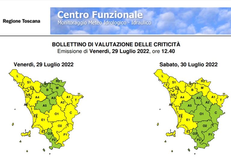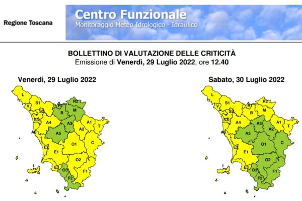 Il Centro funzionale meteo della protezione civile regionale ha emesso un avviso di criticità (codice giallo) riguardante parte del territorio della Toscana per possibili forti temporali con rischio idrogeologico-idraulico del reticolo minore. I temporali sono previsti sparsi e isolati, ma potrebbero comunque interessare anche Livorno e Gorgona dalle 21 di venerdì 29 luglio alle 8 di sabato 30 luglio.