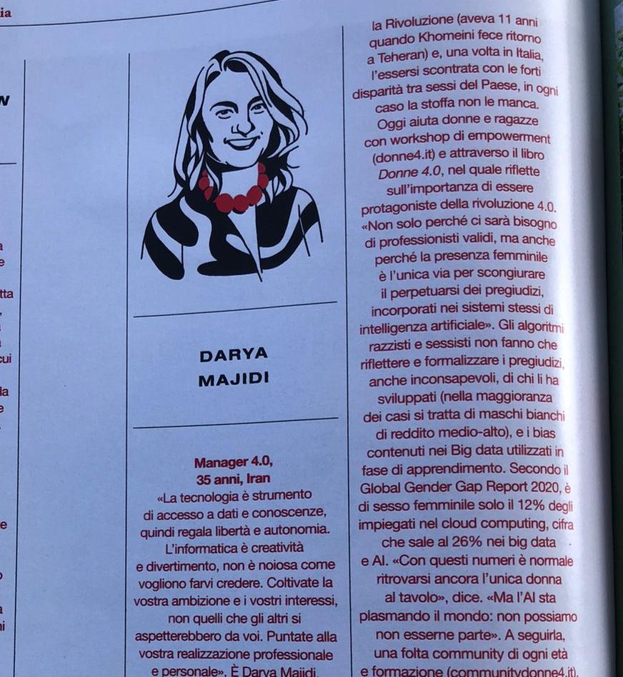 Una goccia nell’oceano. E’ così che si sente Darya Majidi, nata a Tehran e livornese d’adozione, classe 1968 e “imprenditrice 4.0″, nonostante il grandissimo riconoscimento internazionale arrivato proprio sabato 22 agosto con il nuovo numero di D di Repubblica dove è stata inserita tra le “100 donne che cambiano il mondo”. Sono loro per il settimanale al femminile di Repubblica le protagoniste dei cambiamenti di questo pianeta ma non per questo forzatamente e maledettamente forzate sotto i riflettori mondiali. Suddivise in quindici sezioni, come Arte, Economia, Scienza, Moda, Politica, Diritti Umani, e poi Impresa, Letteratura, Sport, Ecologia, Food, Musica, Spettacolo, Media, Società.