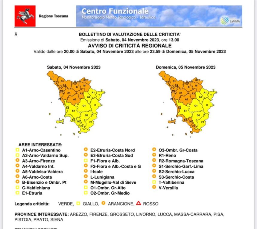Rischio idrogeologico-idraulico del reticolo minore (smottamenti e frane dovuti a esondazioni): allerta gialla fino alle 20.00 di sabato 4 novembre e allerta arancione dalle 20 di stasera alle 11 di domenica 5 novembre.