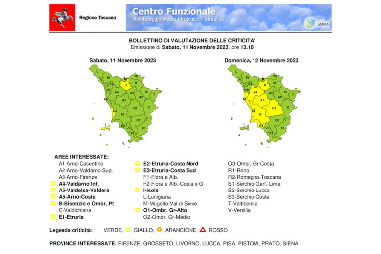 Il codice giallo sarà in vigore domenica 12 novembre, dalle ore 6 alle ore 18, per il transito di una nuova saccatura che porterà condizioni di moderata instabilità. Possibilità di temporali e di occasionali colpi di vento e grandinate. Per domani i mari sono previsti molto mossi.