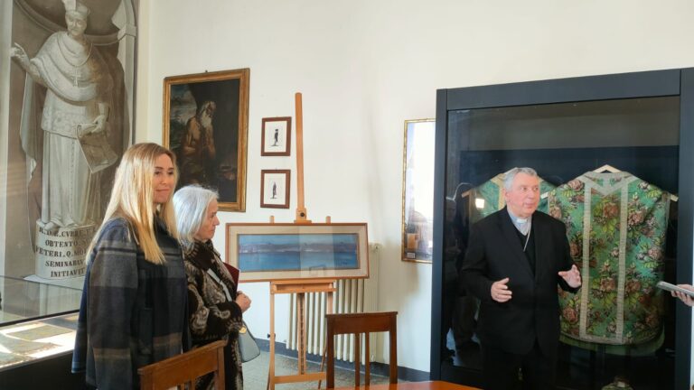 La famiglia del pittore Giorgio Di Giorgio, viareggino, ha donato al museo della Diocesi un quadro dell’artista. Il quadro “torna a casa”, Di Giorgio e la sua famiglia hanno infatti vissuto per diversi anni a Livorno. “Quest’opera mi ha colpito subito – spiega il vescovo Giusti – in particolare il suo andare oltre ciò che si vede. Il colore pastello domina su tutto e dà una sensazione di pace e serenità. Ringrazio infinitamente la famiglia Di Giorgio e mi auguro che molte persone, turisti e cittadini, vengano a visitare il nostro museo”. La moglie Giovanna: “Giorgio viveva di pittura e poesia”. La figlia Francesca: “Questa è l’opera per eccellenza della mostra, esalta tutti i valori di mio padre. E la lettura data da sua Eccellenza del quadro ci ha commosso”. Monsignor Giusti ha inoltre presentato due opere d’arte, presenti anch’esse nel museo diocesano, realizzate dall’artista Fulvio Di Lazzaro.