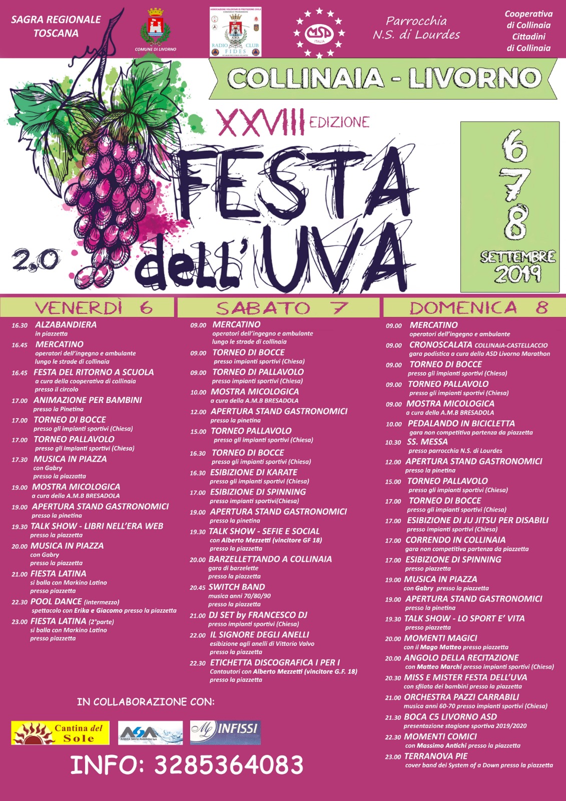 Nelle giornate del 6, 7 e 8 settembre si terrà nel quartiere di Collinaia la XXVIII edizione della Festa dell’Uva (programma), una delle sagre di quartiere più antiche della città. Tre giorni con intrattenimenti di ogni genere: musica (anni 70-80-90, rock, orchestra, dj set), sport (tornei di bocce, di pallavolo, esibizioni di karate, di pole dance, di spinning, di ju-jitsu e domenica 8 corsa podistica e pedalata non competitive aperte a tutti comprese le famiglie), escursioni guidate, mercatini, danza, mostre e stand gastronomici. Punta di diamante in una programmazione fitta di eventi sarà il vincitore del Grande Fratello 2018 Alberto Mezzetti. Una vera festa di quartiere contrassegnata da un 2.0 a memoria della drammatica alluvione di due anni fa quando, appunto, proprio durante la festa, tra il sabato e la domenica, la pioggia portò via in un solo colpo la gioia e il divertimento appena iniziati. L’ “alzabandiera” della festa venerdì 6 settembre alle ore 16.30 nella piazzetta di Collinaia e poi via ai tanti appuntamenti ricreativi a cui tutta la cittadinanza è invitata. Per una festa dell’uva che si rispetti non può mancare assolutamente l’uva e neanche il suo primo derivato, il vino! Cantina del Sole con la propria esperienza darà supporto logistico con punti assaggio. Un’altra azienda molto nota, la Aromolio by Intramark di via della Padula, distribuirà tra i visitatori gadget dei propri prodotti oleari. Inoltre non mancheranno momenti comici con il cabarettista e attore nazionale Massimo Antichi, barzellettando in piazza con tanti comici che si sfideranno in una gara estremamente simpatica. E poi, come nelle migliori feste, non può mancare il mago che farà rimanere a bocca aperta grandi e piccini e il Signore degli Anelli, lanciato in città dal Summer Talent Show e visto quest’estate anche ad Effetto Venezia, dimostrerà che la ginnastica non ha età!