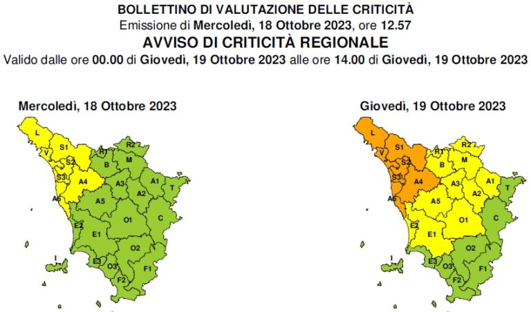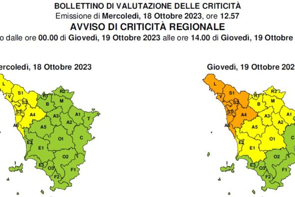Il Centro funzionale meteo della protezione civile regionale ha emanato un’allerta per possibili forti temporali con rischio idrogeologico e idraulico del reticolo minore, riguardante principalmente il territorio della Toscana settentrionale e centrale (isole escluse). Per quanto riguarda Livorno, codice giallo in vigore mercoledì 18 ottobre, dalle ore 18 fino a mezzanotte, per poi proseguire in allerta arancione fino alle ore 14 di giovedì 19 ottobre (sempre per forti temporali con rischio idrogeologico e idraulico del reticolo minore). Con ordinanza dell’Amministrazione comunale, è stata disposta la chiusura di scuole e servizi educativi, centri diurni, ludoteche, parchi e cimiteri durante l’allerta arancione (quindi dalla mezzanotte di oggi alle ore 14 di domani, giovedì 19 ottobre). Si raccomanda di limitare gli spostamenti e di adottare scrupolosamente tutti i comportamenti corretti previsti per i rischi annunciati.