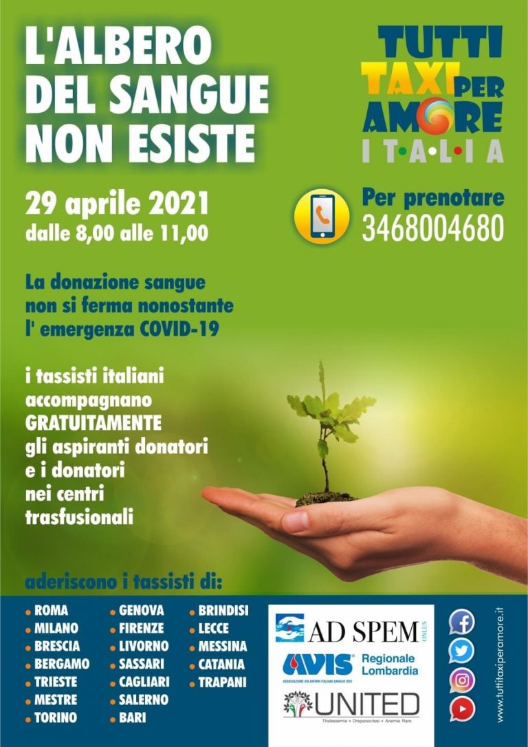 Per il secondo anno consecutivo l’Associazione “Tutti Taxi per amore” organizza una campagna di aiuti per i volontari che vorranno donare il sangue giovedì 29 aprile. Coloro che vorranno donare il sangue in occasione della giornata “L’albero del sangue non esiste” potranno quindi raggiungere il centro di donazione in taxi gratuitamente, prenotandosi al numero indicato.