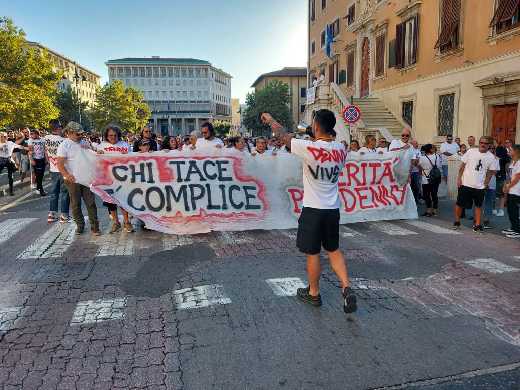 Una maglia bianca con una scritta nera e un cuore rosso: “Denny Vive”. Il sindaco di Livorno, Luca Salvetti, scende in piazza così a fianco di familiari e amici per questo secondo corteo dove in tanti, circa 300 persone, hanno chiesto a gran voce “Giustizia per Denny”. Si sono ritrovati davanti a Palazzo Civico intorno alle 18 di domenica 18 settembre. Qui sono saliti sulle scale srotolando uno striscione che poi è rimasto appeso ad una finestra del Comune: “Giustizia per Denny”. Dietro mamma Erika, il padre Sky gli amici più cari, il sindaco Salvetti e la sorella Asya. È stata lei a prendere il megafono in mano e a leggere una lettera ai tanti intervenuti. “La parola d’ordine è chiarezza. Queste manifestazioni sono organizzate dai familiari e dagli amici di Denny per chiedere giustizia – ha detto la sorella dall’alto verso la piazza – Questa giustizia si unisce ad una causa che ci accomuna tutti indistintamente da religione, credo e provenienza. Chiediamo che non ci sia più un altro Denny. È per questo che portiamo avanti queste iniziative e peroriamo il nostro obiettivo”.