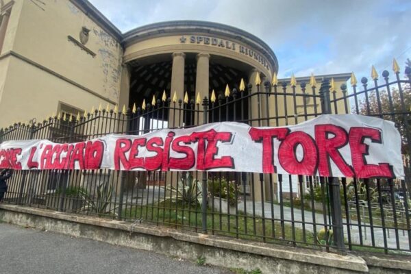 “Come l’acciaio resiste Tore”. E’ lo striscione apparso nelle ultime ore in via Gramsci davanti all’ospedale per Salvatore. Altri messaggi di vicinanza sono stati esposti recentemente allo stadio Picchi durante Us Livorno 1915 – Sanbenedettese di metà ottobre e ieri sera durante le partite di basket della Pielle al Pala Macchia e della Libertas al Modigliani Forum. “Vogliamo fargli sentire tutta la nostra vicinanza in questo momento difficile – spiegano gli amici che ringraziamo per la disponibilità – E’ una persona squisita e altruista, che si è sempre prodigata per gli altri, conosciuta e ben voluta. Lo dimostra il fatto che anche tifoserie calcistiche di altre squadre, come Perugia lunedì sera, gli hanno dedicato uno striscione. Tore, stavolta devi lottare per te stesso e tutti noi”.