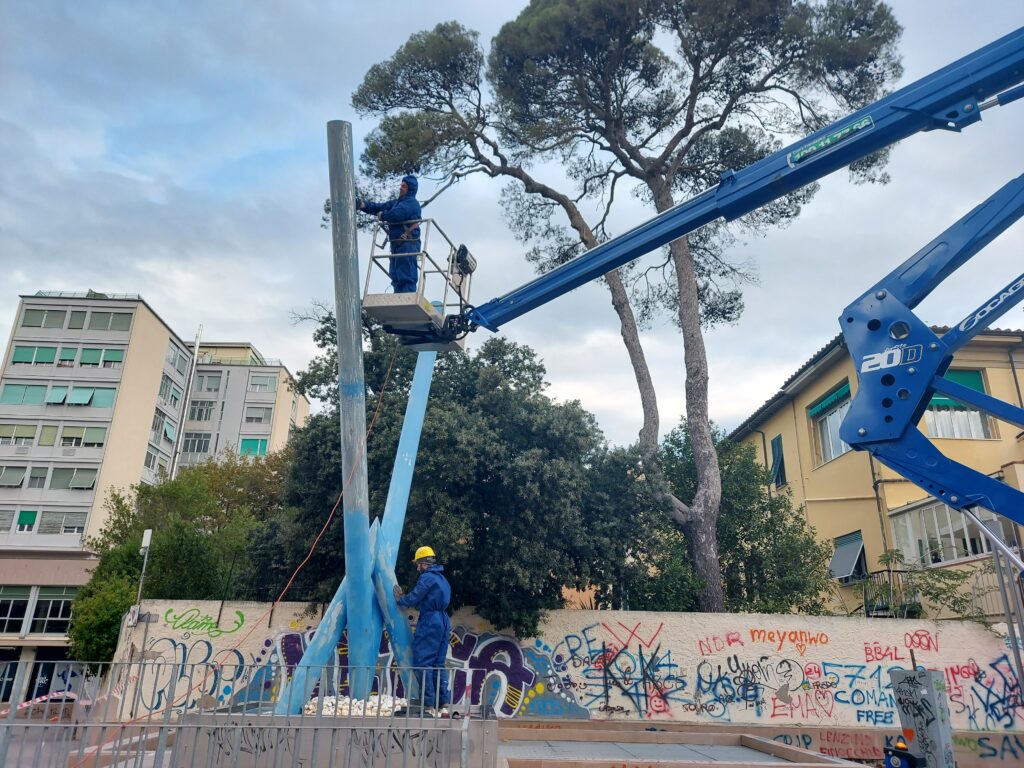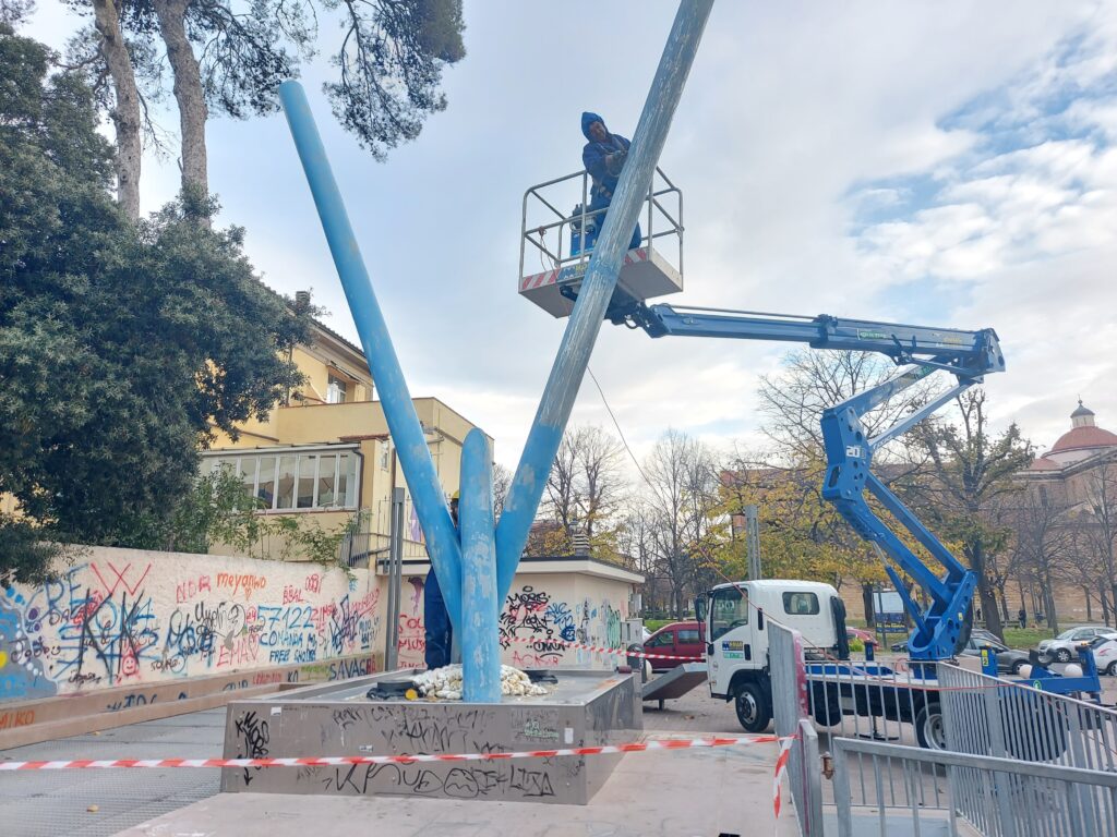 La parte metallica del basamento sarà ripulita, mentre per la parte sottostante in sassi bianchi, vandalizzati, è prevista una ricostruzione dello stesso tipo, ma con i sassi cementati. Fra tre o quattro giorni al massimo l’opera dunque dovrebbe tornare a splendere nel lato est della piazza. Il lotto di lavori che ha previsto, oltre a questo monumento, anche il restauro dell’opera di Spagnoli, è costato 12mila euro.