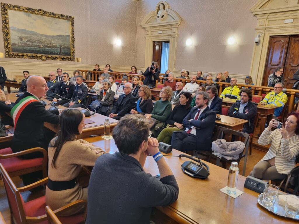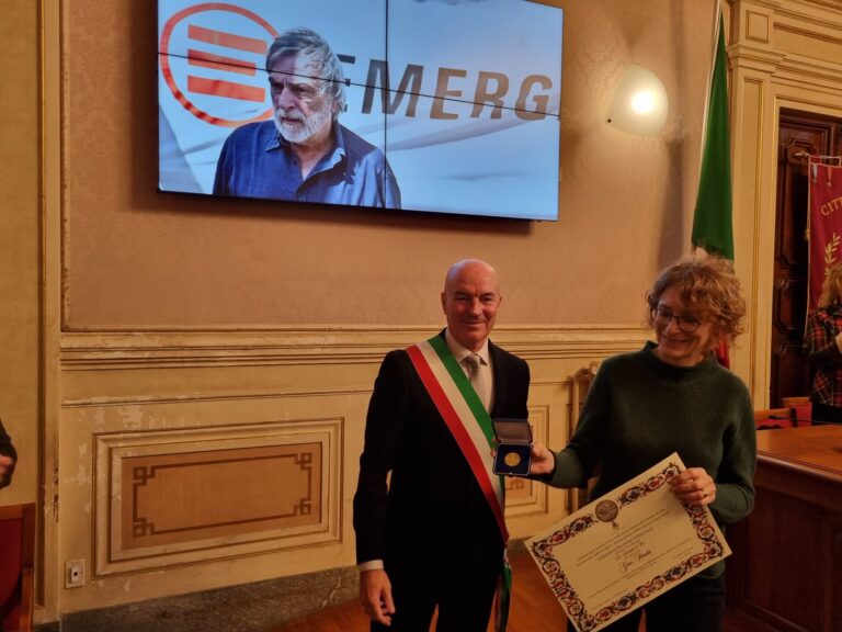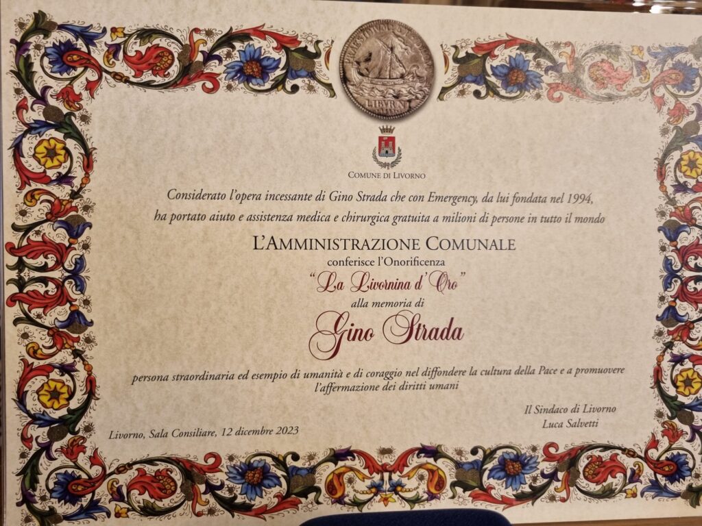 “Nel modo in cui ha vissuto Gino ritroviamo i valori di accoglienza della città di Livorno. E la mia proposta di dedicare la Livornina d’oro a Strada è stata accolta subito dalla giunta. In questo anno abbiamo accolto 8 navi, la prima nave è stata proprio la nave di Emergency nel dicembre 2022, e 1000 migranti. Grazie Gino, Livorno è come te”. Alla presenza dei volontari della onlus, dell’assessora regionale Monni, della vice sindaca Camici, degli assessori Raspanti, Garufo e Ferroni, di don Razzauti, della presidente della Provincia Scarpellini, del consigliere regionale Gazzetti, del questore Stellino, della comandante della polizia municipale Maritan, della Protezione civile di Livorno, del direttore Svs Cantini il sindaco ha consegnato alla moglie di Gino Strada, Simonetta Gola, la massima onorificenza cittadina. Al termine del discorso del sindaco tutti in piedi per un lungo applauso. Gola, moglie di Gino Strada, nonché direttrice della comunicazione di Emergency: “In tema di sbarchi, Livorno ha praticato l’accoglienza, siamo contenti di sapere che la città sente questo legame con noi”.