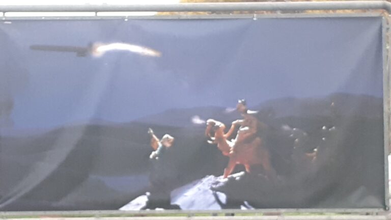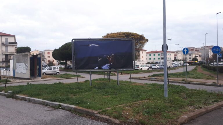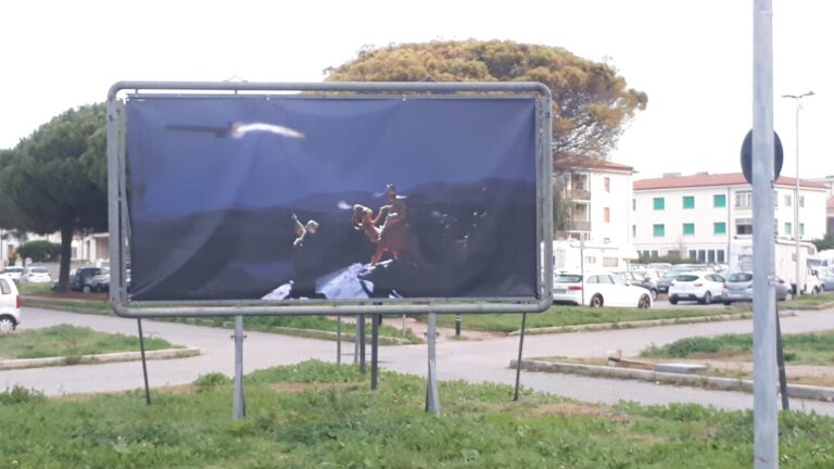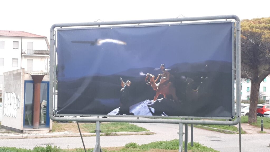 I Re Magi che inseguono un missile che squarcia il cielo scuro con la sua scia. È questa l’opera provocatoria, stampata su di un telone di 6 metri per tre, apparsa al “Curvone” di viale della Libertà all’interno della cornice che un tempo ospitava pubblicità e che per più di un anno ha visto campeggiare l’installazione del tavolino sospeso con l’apparecchiatura per due in tempo di restrizioni Covid. Il telone provocatorio rappresenta, in concomitanza con l’arrivo dell’Epifania, i tre saggi astrologi della tradizione cattolica che, invece di seguire la famosa cometa che porterà loro alla mangiatoia del Bambin Gesù, indicano un missile, simbolo forse dell’attuale guerra in Ucraina ma più genericamente simbolo di tutte le guerre che attualmente stanno insanguinando il Pianeta.