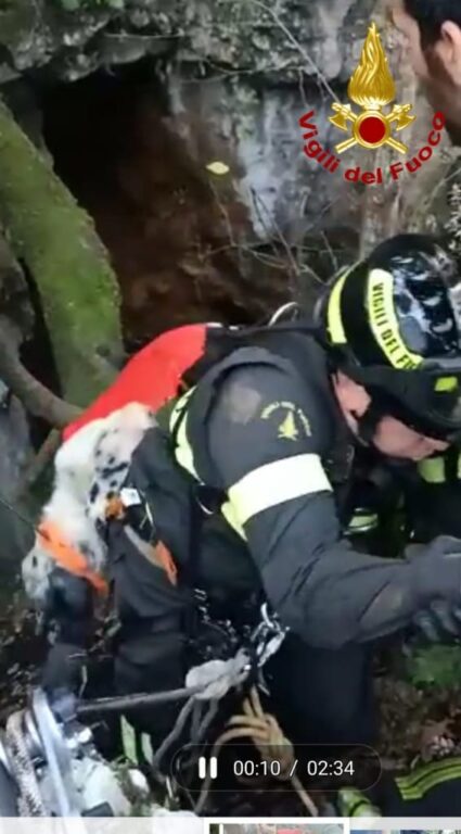 I vigili del fuoco salvano un cane caduto in una voragine