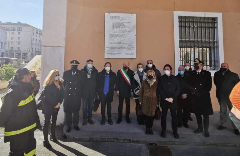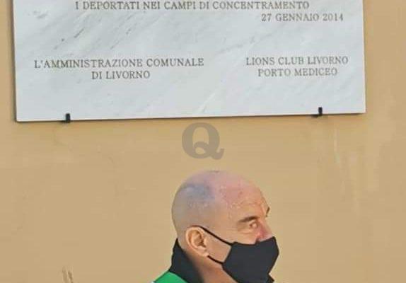 breve cerimonia del Lions Club Livorno Porto Mediceo sotto la targa fatta affiggere sette anni fa sul muro di Palazzo Civico con la celeberrima poesia di Primo Levi "Se questo è un uomo"