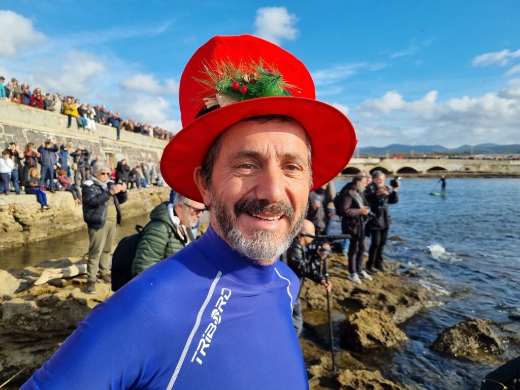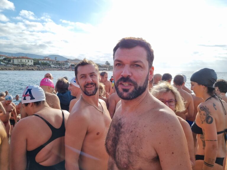 Amici del Mare alla spiaggia dei Tre Ponti con Roberto Onorati che dal 1990 organizza il tuffo di Capodanno degli Amici del Mare e si tuffa con tutti gli altri partecipanti. 3 2 1… via tutti (103 iscritti) sotto al gonfiabile Avis al grido di buon anno. Amici del Gabbiano alla spiaggia del Gabbiano con Massimo Volpi, organizzatore, che ormai ha perso il conto delle edizioni. Sul cartellone delle iscrizioni si sono segnati in 175 e tra loro anche babbo Alessio (“mi tuffo qui da 10 anni ormai”) e il figlio Jacopo, 5 anni. “E’ la sua prima volta è la mascotte di questa edizione” dice sorridendo prima di indossare il costume. Con qualche minuto di anticipo rispetto a mezzogiorno il tuffo ha avuto inizio, dopo naturalmente la foto di gruppo. Presente sia al Gabbiano che ai Tre Ponti, per un saluto, il sindaco Salvetti. Niente bagno di Capodanno. Per ora. “Mi tufferò quando le due associazioni saranno unite”. E scherza ma non troppo: “Lavorerò a questo obiettivo quest’anno per riuscire a tuffarmi il prossimo Capodanno, l’ultimo da sindaco”. Alla fine sulle due spiagge… sbicchierata. Tantissime le persone sulle spallette con la polizia municipale impegnata a regolare la viabilità.
