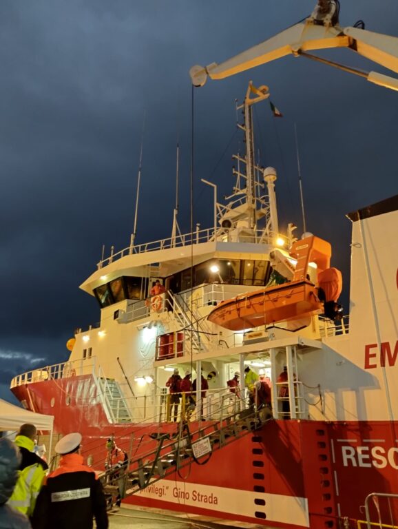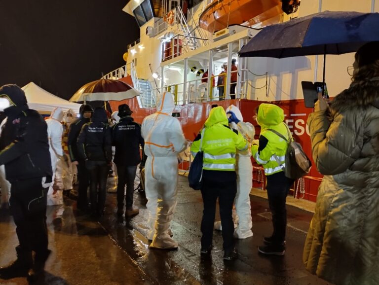 L’arrivo della Life Support di Emergency nella giornata di giovedì 22 dicembre – Ha ormeggiato intorno alle 6.40 alla banchina 75 del porto di Livorno la nave Life Support di Emergency, con a bordo circa 140 migranti. Fra questi risultano al momento 24 minori non accompagnati, sopra i 14 anni (più due bambini insieme alle loro mamme), ma i numeri sono in evoluzione e saranno aggiornati man mano che procederanno le operazioni di identificazione e valutazione sanitaria. Di questi, alcuni (probabilmente 4) resteranno a Livorno, accolti al centro Il Melo, altri verranno trasferiti al Cas di Piombino fatto aprire dal Prefetto. I naufraghi, nel momento di lasciare la nave per le fasi di accoglienza a terra, si sono scambiati lunghi abbracci con gli operatori di Emergency che li hanno salvati, accuditi, curati, vestiti, sfamati. Per il 23 dicembre nelle prime ore della mattinata è attesa la nave tedesca Sea Eye 4, con un altro centinaio di migranti a bordo. All’accoglienza allo sbarco il sindaco Luca Salvetti come autorità di Protezione Civile che dichiara: “Sta andando bene, ci eravamo preparati, nel senso che i percorsi studiati e preparati per una giusta accoglienza a seconda della persona che scendeva dalla nave, hanno funzionato a pieno. Una prima fase è stata gestita con le persone che presentavano patologie, che sono state assistite immediatamente; una seconda fase con le donne e i bambini. Momenti molto ravvicinati. E’ stata una grande emozione vedere bambini piccolissimi che scendevano dall’imbarcazione e poi gli adulti che sono già in area di check, sia per le generalità sia per quanto riguarda l’aspetto sanitario, e che poi raggiungeranno le destinazioni che sono state scelte”.