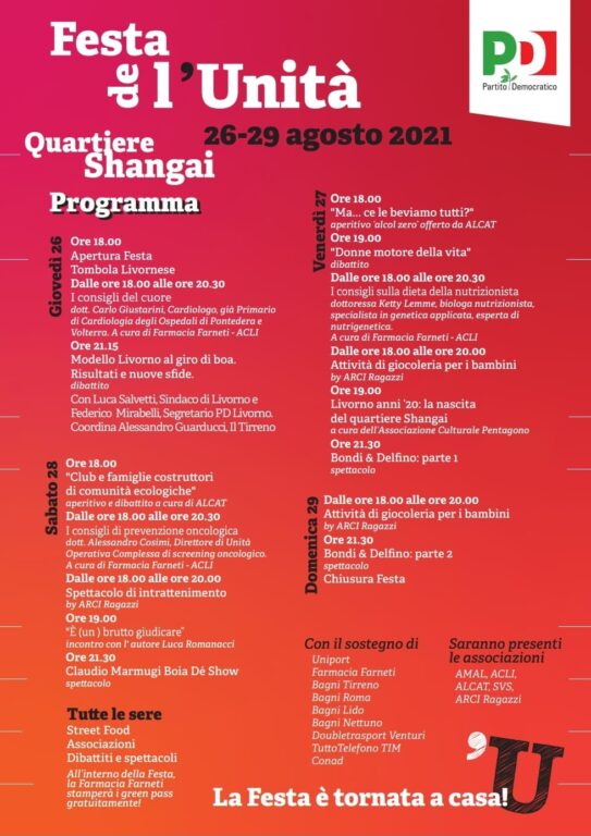 La Festa dell’Unità torna nel quartiere Shangai. Anche per quest’anno il Partito Democratico, a causa della pandemia, rinuncia alla Rotonda e si sposta nei quartieri. Quattro giorni (dal 26 al 29) che avranno un format diverso a quello conosciuto nelle passate edizioni (clicca qui per consultare il programma completo della manifestazione).