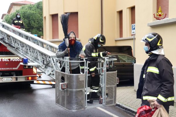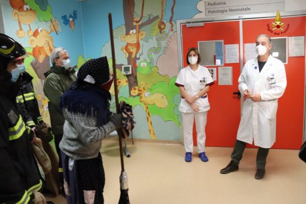 La Befana, a bordo del cestello della scala aerea in dotazione al comando dei pompieri, ha salutato i bambini attraverso le finestre del reparto e, accompagnata dal personale dei vigili del fuoco e da quello dell’Associazione Nazionale dei Vigili del Fuoco, ha incontrato il primario del reparto, il dottore Roberto Danieli, e la coordinatrice infermieristica, Elena Wust, ai quali stati consegnati alcuni doni e calze, da distribuire ai bambini in un successivo momento.