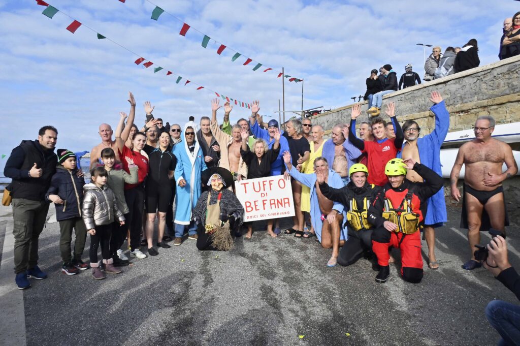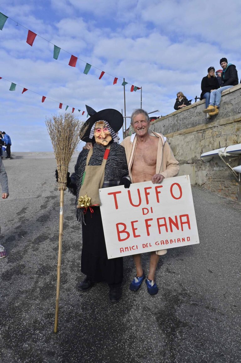 Foto di rito, poi nuotata veloce, doccia, accappatoio e cioccolata calda con panettone. Ecco servito il rito del bagno di Befana per gli Amici del Gabbiano. Non poteva mancare poi la vecchia signora con la scopa