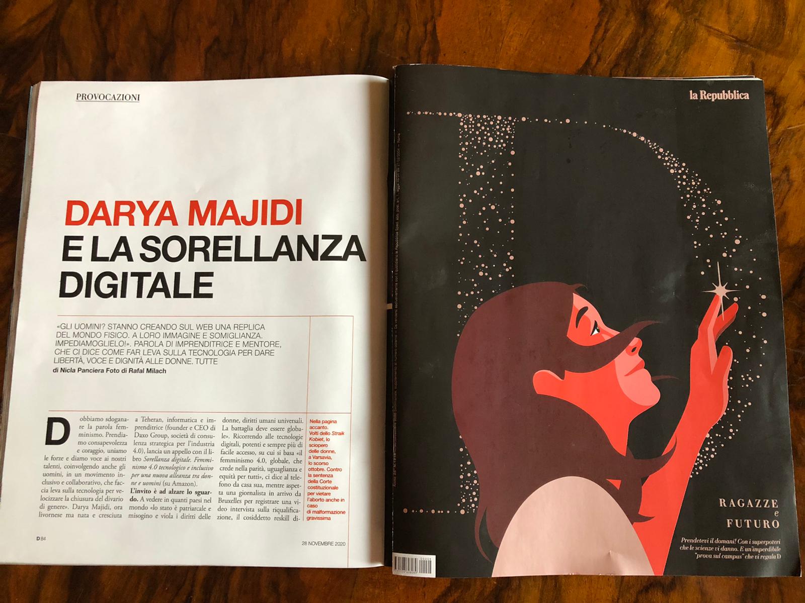 A quasi due mesi di distanza dalla presentazione ufficiale “Sorellanza Digitale”, il secondo libro dell’imprenditrice livornese Darya Majidi, sbarca sulle pagine di “D” di Repubblica, il settimanale nato come allegato al quotidiano fondato da Eugenio Scalfari nel 1976 ma con il tempo, di fatto, diventato il magazine di riferimento per il mondo femminile.