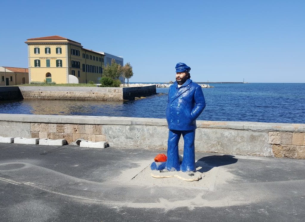 Nella foto principale la statua di Bud alla Bellana. Nella seconda immagine il creatore, l'artista Galli, in posa insieme alla sua opera sul lungomare di Livorno