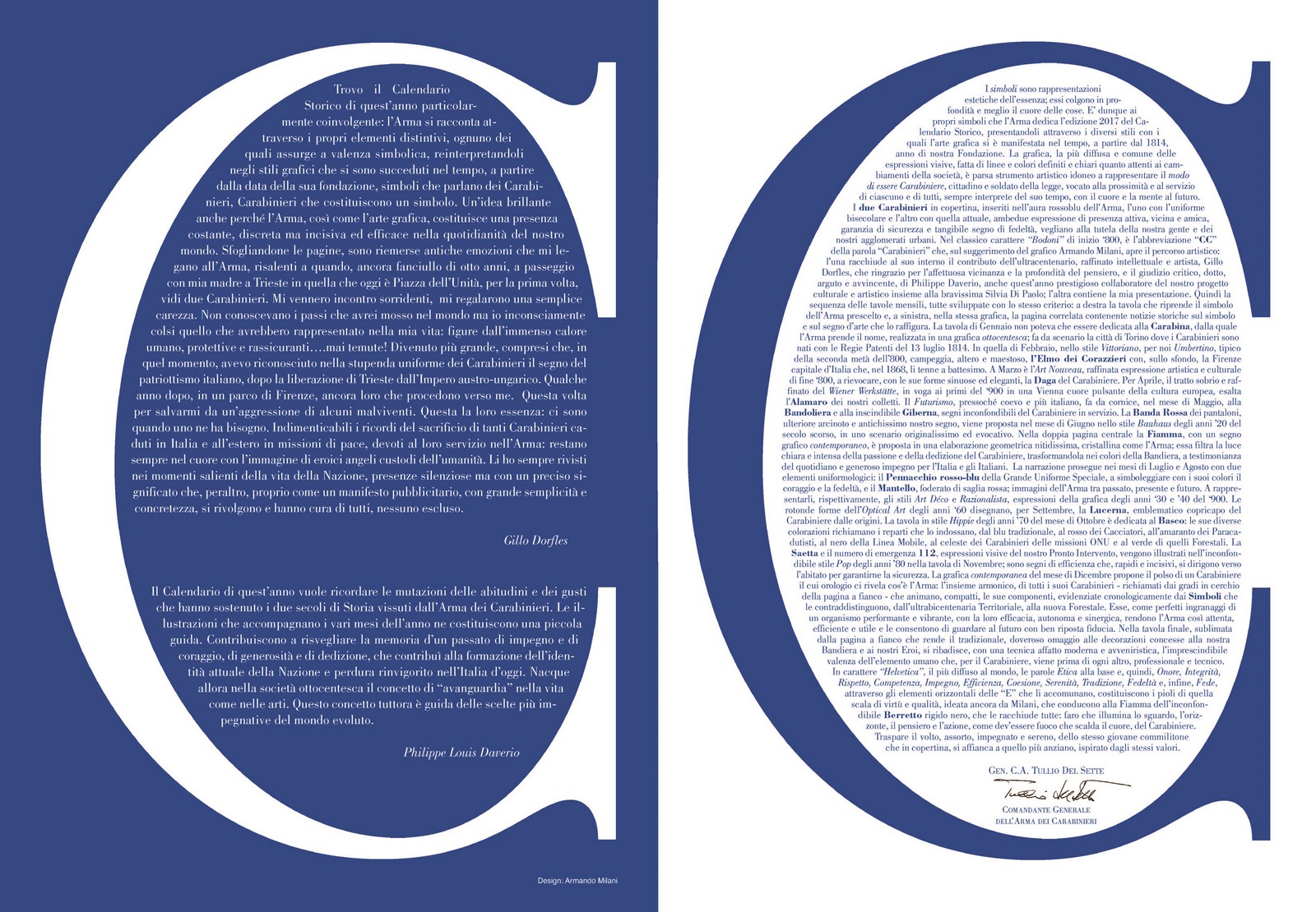 I due Carabinieri in copertina, inseriti nell’aura rossoblu dell’Arma, l’uno con l’uniforme bisecolare e l’altro con quella attuale, ambedue espressione di presenza attiva, vicina e amica, garanzia di sicurezza e tangibile segno di fedeltà, vegliano alla tutela della nostra gente e dei nostri agglomerati urbani. Nel classico carattere “Bodoni” di inizio ‘800, è l’abbreviazione “CC” della parola “Carabinieri” che, sul suggerimento del grafico Armando Milani, apre il percorso artistico: l’una racchiude al suo interno il contributo dell’ultracentenario, raffinato intellettuale e artista, Gillo Dorfles, che ringrazio per l’affettuosa vicinanza e la profondità del pensiero, e il giudizio critico, dotto, arguto e avvincente, di Philippe Daverio, anche quest’anno prestigioso collaboratore del nostro progetto culturale e artistico insieme alla bravissima Silvia Di Paolo; l’altra contiene la mia presentazione. Quindi la sequenza delle tavole mensili, tutte sviluppate con lo stesso criterio: a destra la tavola che riprende il simbolo dell’Arma prescelto e, a sinistra, nella stessa grafica, la pagina correlata contenente notizie storiche sul simbolo e sul segno d’arte che lo raffigura.