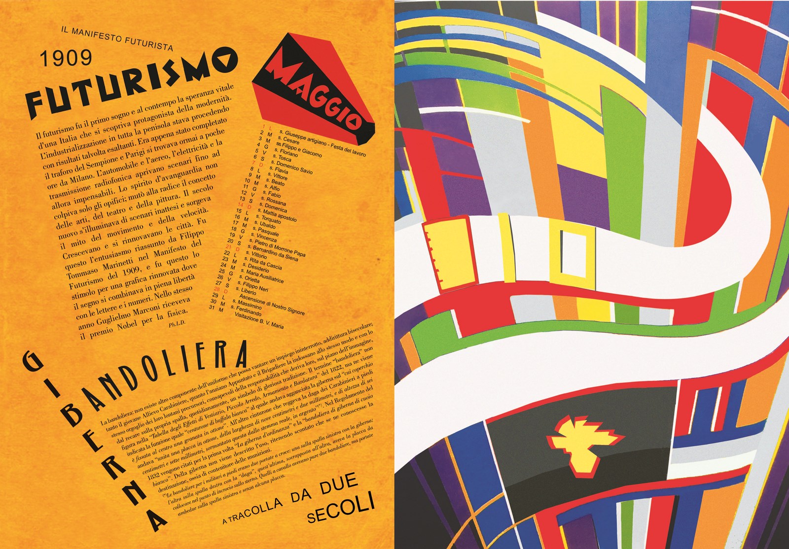 Il Futurismo, pressoché coevo e più italiano, fa da cornice, nel mese di Maggio, alla Bandoliera e alla inscindibile Giberna, segni inconfondibili del Carabiniere in servizio. La Banda Rossa dei pantaloni, ulteriore arcinoto e antichissimo nostro segno, viene proposta nel mese di Giugno nello stile Bauhaus degli anni ’20 del secolo scorso, in uno scenario originalissimo ed evocativo.