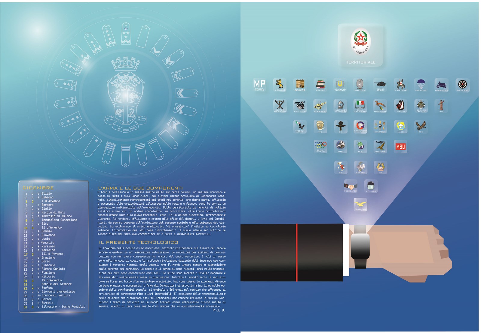La grafica contemporanea del mese di Dicembre propone il polso di un Carabiniere il cui orologio ci rivela cos’è l’Arma: l’insieme armonico, di tutti i suoi Carabinieri – richiamati dai gradi in cerchio della pagina a fianco – che animano, compatti, le sue componenti, evidenziate cronologicamente dai Simboli che le contraddistinguono, dall’ultrabicentenaria Territoriale, alla nuova Forestale. Esse, come perfetti ingranaggi di un organismo performante e vibrante, con la loro efficacia, autonoma e sinergica, rendono l’Arma così attenta, efficiente e utile e le consentono di guardare al futuro con ben riposta fiducia. Nella tavola finale, sublimata dalla pagina a fianco che rende il tradizionale, doveroso omaggio alle decorazioni concesse alla nostra Bandiera e ai nostri Eroi, si ribadisce, con una tecnica affatto moderna e avveniristica, l’imprescindibile valenza dell’elemento umano che, per il Carabiniere, viene prima di ogni altro, professionale e tecnico. In carattere “Helvetica”, il più diffuso al mondo, le parole Etica alla base e, quindi, Onore, Integrità, Rispetto, Competenza, Impegno, Efficienza, Coesione, Serenità, Tradizione, Fedeltà e, infine, Fede, attraverso gli elementi orizzontali delle “E” che li accomunano, costituiscono i pioli di quella scala di virtù e qualità, ideata ancora da Milani, che conducono alla Fiamma dell’inconfondibile Berretto rigido nero, che le racchiude tutte: faro che illumina lo sguardo, l’orizzonte, il pensiero e l’azione, come dev’essere fuoco che scalda il cuore, del Carabiniere. Traspare il volto, assorto, impegnato e sereno, dello stesso giovane commilitone che in copertina, si affianca a quello più anziano, ispirato dagli stessi valori”.