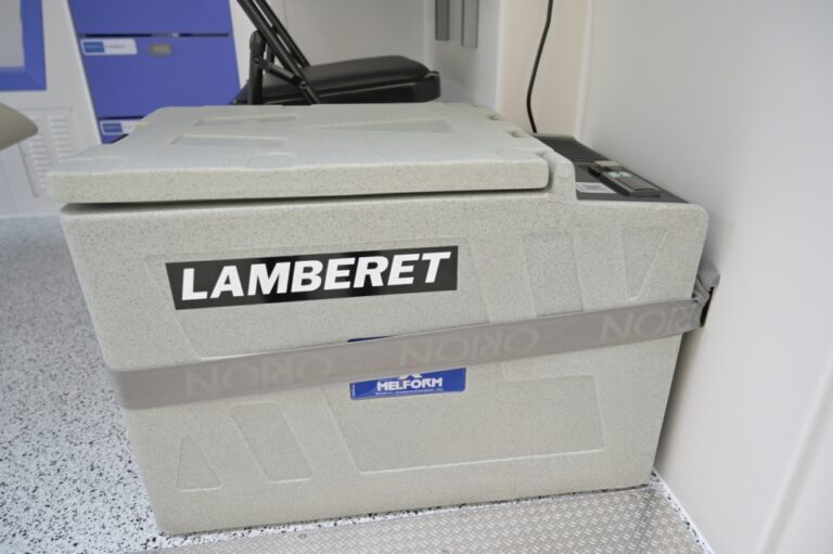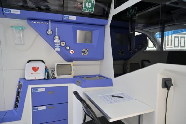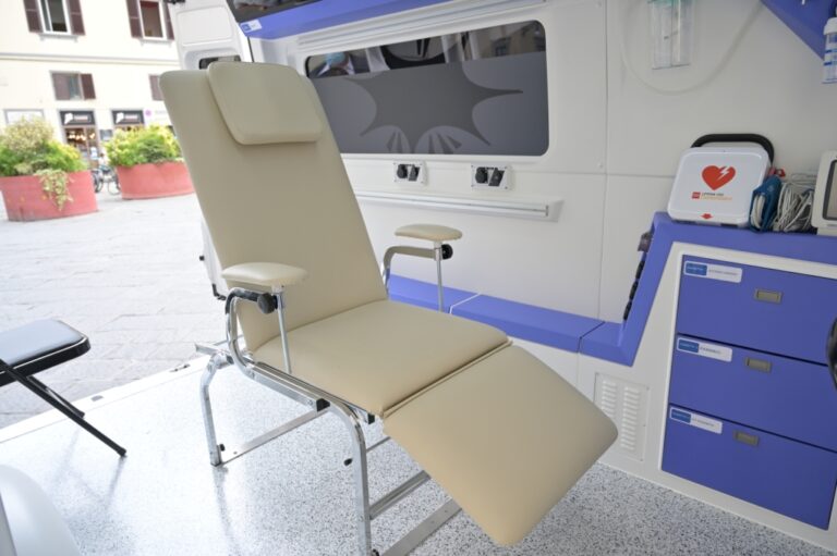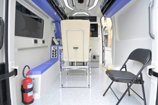 Il veicolo, oggetto della donazione da parte di Toscandia, è stato realizzato su chassis Volkswagen Crafter, mezzo ideale per questo tipo di allestimento. Le caratteristiche del veicolo consentono l’uso degli spazi interni per quale è stato destinato, ovvero portare la possibilità di vaccinazione anti Covid-19 anche nei posti più remoti e presso persone con difficoltà a spostarsi verso i principali hub vaccinali. Gli interni del veicolo sono realizzati secondo i più alti standard di qualità e in conformità all’ultimo modello di allestimento Maxima, studiato e progettato negli ultimi due anni. Questo allestimento, realizzato in ASA e Baydur 110, entrambi trattati secondo lo standard Pure Health con proprietà antibatteriche e virucide, permettono un più sicuro ambiente di lavoro tramite un processo di fotocatalisi brevettato da Orion, che secondo gli ultimi test effettuati contro il Covid-19 ne riduce la presenza del 75% già dopo 30 minuti e un abbattimento, pressoché completo, dopo 2 ore. Altra caratteristica fondamentali di Pure Health è la peculiarità di continua sanificazione anche con persone a bordo senza l’uso di materiali di ricambio né di attivazione manuale del sistema. Inoltre, l’impianto a led di illuminazione interna, compresa di cromoterapia, fa sì che l’ambiente sia anche più confortevole per i pazienti e gli operatoti a bordo. Il veicolo dispone di un impianto di erogazione di ossigeno in caso di necessità, contenente fino a due bombole da 7 litri e un impianto di aspiratore di secreti. L’impianto di condizionamento originale è stato potenziato e canalizzato nel vano sanitario tramite una canalizzazione coibentata con materiali antibatterici (tramite l’uso di Stifferene, materiale utilizzato anche nei sistemi di condizionamento ospedalieri). La parte esterna del veicolo, infine, è dotato di due spoiler, a minimo ingombro, dotati di 168 luci blu a led ad alta efficienza sia energetica che luminosa, e di luci laterali e frontali per illuminare l’area circostante in caso di necessità.