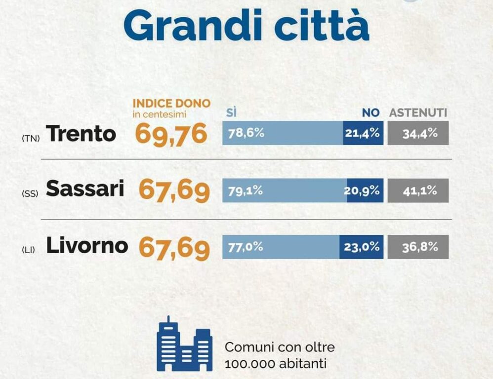 Livorno seconda città più generosa di Italia, a pari merito con Sassari, per Indice del dono, il rapporto del Centro Nazionale Trapianti che analizza i dati delle dichiarazioni di volontà di donazione degli organi rilasciate quando si rinnova la carta d’identità. La notizia è stata pubblicata dall’Usl Toscana nord ovest sulla propria pagina Fb, che ha ripostato il post Fb della pagina Centro Nazionale Trapianti, e ve la proponiamo. Trento è la città più generosa d’Italia. Nel 2022, sono state 2.8 milioni le espressioni di volontà rese nei Comuni ma i “no” alla donazione sono ancora troppi, sopratutto tra gli over 70, nella errata convinzione che sia impossibile diventare donatori ad un età avanzata. Proprio per questo, è fondamentale diffondere una corretta informazione e facilitare una scelta consapevole.