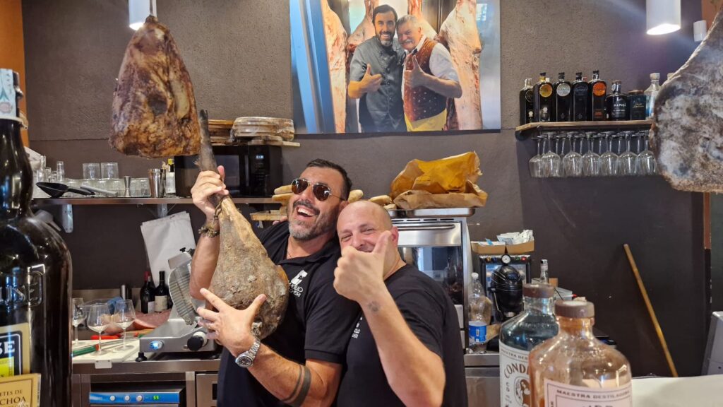 Nella foto principale uno dei due titolari del negozio, Omar Barsacchi (a sinistra) che ironicamente "suona" un prosciutto di cinghiale accanto al responsabile della bottega, l'istrionico Nicola Carrai. Nelle altre immagini il premio di Campione Regionale ricevuto da Gambero Rosso e la foto di Barsacchi con il mitico Dario Cecchini