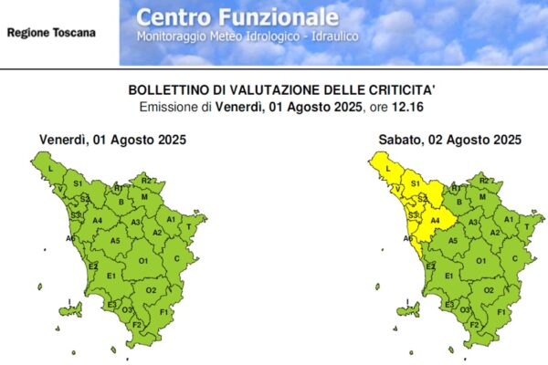Dal mattino di sabato 2 agosto è atteso un aumento delle condizioni di instabilità sulla Toscana nord-occidentale, comprese Livorno e Gorgona, con possibilità di precipitazioni sparse temporalesche, che potranno risultare localmente persistenti.