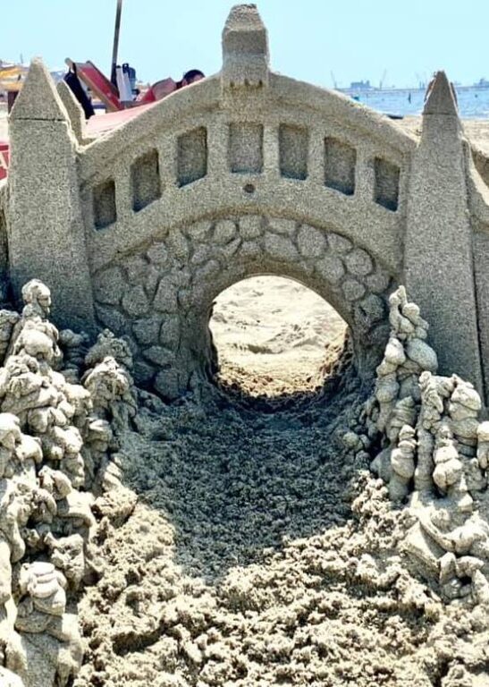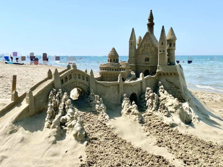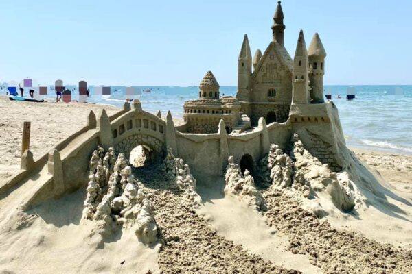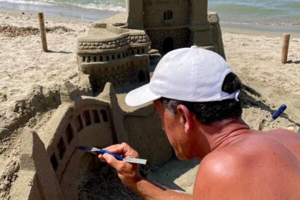 Diciamolo subito: lì per lì leggendo la mail arrivata il 18 agosto (“Buonasera, ho realizzato un castello di sabbia…”) non abbiamo capito bene la cosa. Un secondo dopo, aprendo gli allegati, siamo rimasti a bocca aperta. E pensare che per Marco Quercioli, imprenditore livornese di 55 anni, questa è solo una passione. “Ho iniziato nel 2016 e da allora ogni estate cerco di realizzare almeno una scultura di sabbia. E’ diventato un “rito”. Solo sabbia e acqua di mare. Nel tempo mi sono migliorato sempre più. Quella di quest’anno è l’opera più grande”. Parliamo di un castello largo 2,80 m, alto 1,30 m e profondo 60 cm (nelle foto il castello di sabbia 2021, Marco all’opera, il castello 2020 e il teatro romano 2020). L’intento, riuscito, era quello di riprodurre il castello della Disney. Per realizzarlo Marco ha preparato a casa una cassa di legno contenente sabbia e acqua di mare come stampo rettangolare – stampo che serve solo nella fase iniziale e poi viene tolto – e una volta in spiaggia per completare l’opera ha impiegato circa quattro giorni con l’ausilio di spatoline per realizzare i dettagli. “Come fa a restare in piedi, c’è un segreto? Nessun segreto particolare, occorre pressare bene la sabbia affinché rimanga compatta, cosa non facile a Tirrenia considerando che è un po’ granulosa, e tenerla umida il più possibile. In questo mi ha aiutato mia moglie, che ringrazio, bagnandola con lo spruzzino”. Marco tiene inoltre a ringraziare di cuore anche il bagno Uappala a Calambrone, dove Marco e famiglia sono clienti e dove questo castello è stato realizzato, per il permesso e il contributo dato alla realizzazione (recinzione e attrezzature varie).