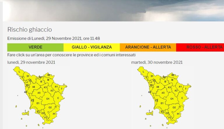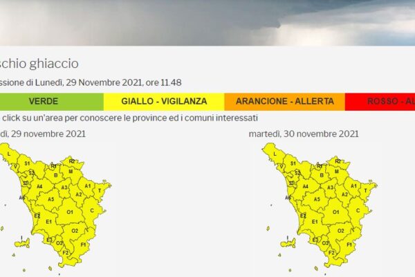 Il Centro di monitoraggio meteo della Protezione Civile regionale ha emanato un avviso di criticità (codice giallo) per rischio ghiaccio valido su tutto il territorio della Toscana dalle 20 di lunedì 29 novembre, fino alle 10 di martedì 30 novembre