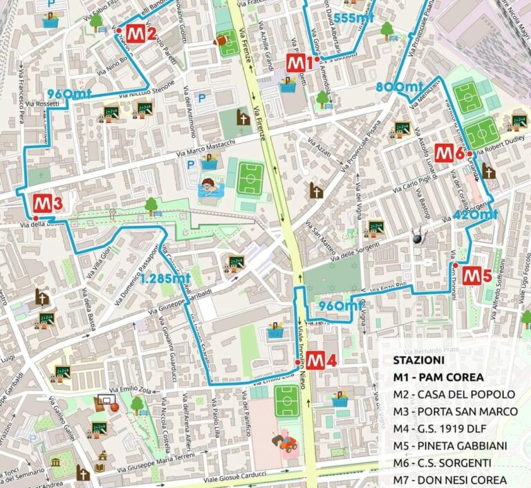 È un percorso urbano caratterizzato da 7 “stazioni” di partenza, salita, discesa e arrivo, la cui distanza e i cui orari consentono ai singoli, o a gruppi di persone, di salire su “convogli pedonali” formati da gruppi di persone omogenee per caratteristiche e capacità motorie permettendo quindi di muoversi alle diverse velocità