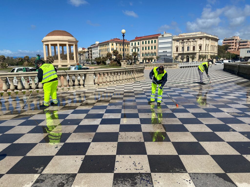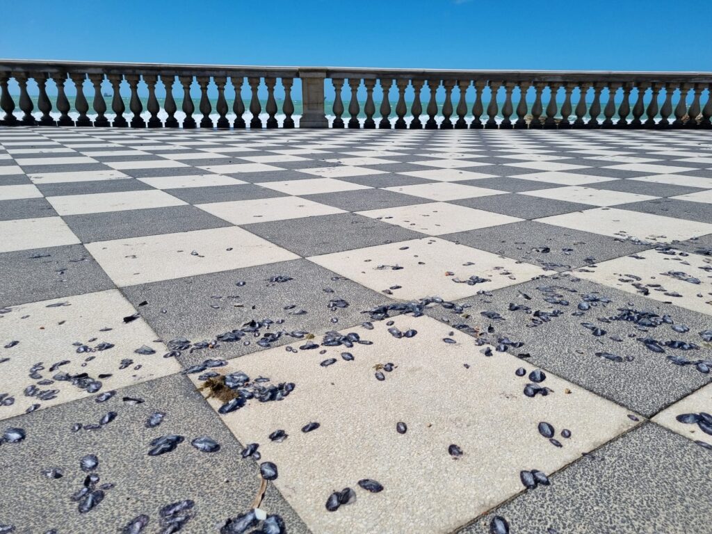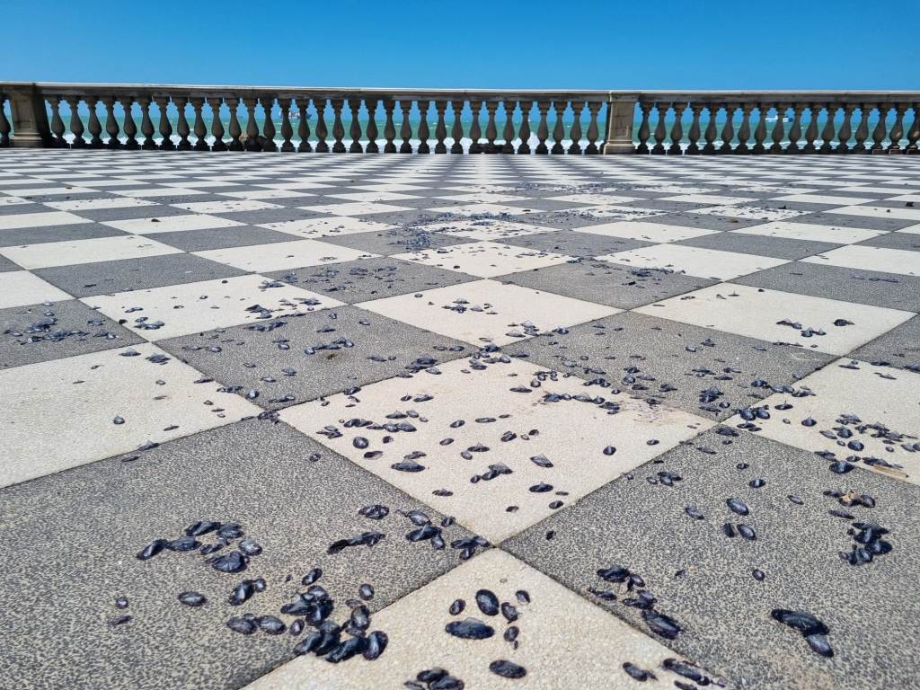 Visibilissime "spiaggiate" sulla scacchiera, basta affacciarsi lato Palazzo Pancaldi per accorgersi che ce ne sono a migliaia in mare. Intervento delle Squadre di Pronto Intervento e degli Operatori di Quartiere di Aamps Livorno/RetiAmbiente con mini-spazzatrici, idro-pulitrici e spazzoloni