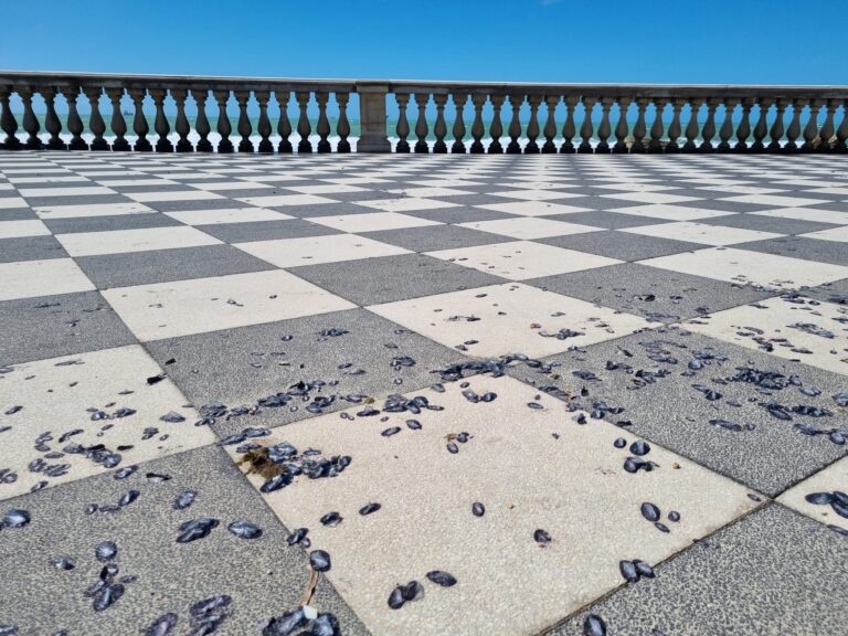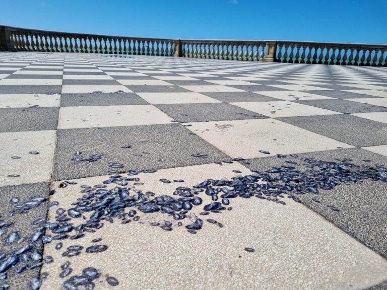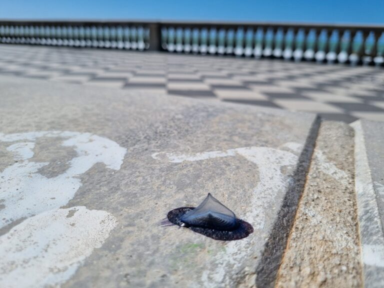 Tutte uguali. Nella dimensione e nel colore, ma anche nella forma. Sono meduse Velelle, come conferma Arpat che ringraziamo per la disponibilità, e sono arrivate in queste ultime ore alla Terrazza Mascagni spinte verosimilmente dalla mareggiata. Visibilissime “spiaggiate” sulla scacchiera, basta affacciarsi lato Palazzo Pancaldi per accorgersi che ce ne sono a migliaia in mare. Arpat: “Sono piccole meduse che in questo periodo (in genere ad aprile e maggio) si spiaggiano sulle coste dalla Liguria al Lazio. Sono innocue per noi ma gli ammassi possono dare qualche problema alle reti dei pescatori”.