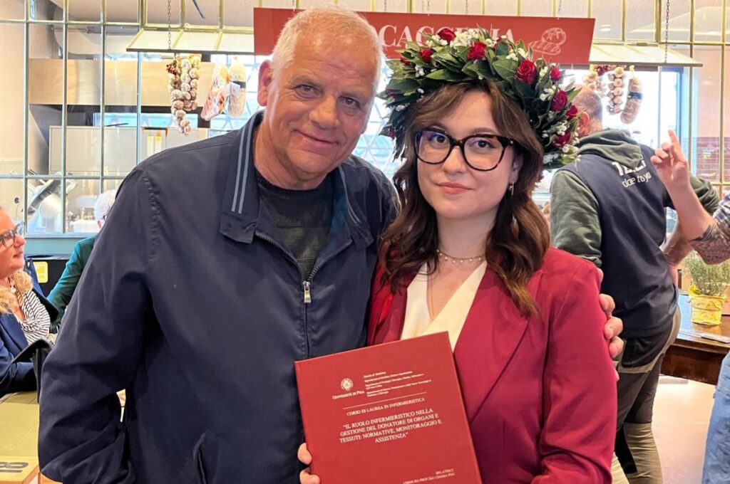 Si chiama Naemi, il 28 aprile compirà 23 anni, e il 15 aprile si è laureata in infermieristica al Polo Didattico di Livorno discutendo la tesi all’Università di Pisa dal titolo “Il ruolo infermieristico nella gestione del donatore di organi e tessuti: normative, monitoraggio ed assistenza”. E il capitolo finale della tesi, la 22enne livornese ha voluto dedicarlo alla storia di Christian Bartoli, figlio di Mario, scomparso nel 1998 a 17 anni. “Una storia che io non ho vissuto personalmente poiché non ero ancora nata. Tuttavia, quando ho detto a mamma quale sarebbe stato l’argomento della tesi lei mi ha parlato della sua storia. Una storia che parla di donazione di organi e che ho quindi pensato di inserire per sensibilizzare i giovani come me su un tema così grande e importante. Se da una parte il dolore per lui è stato ed è lacerante e inimmaginabile, dall’altra ha trovato il modo di fargli vivere la sua vita. Ha un cuore d’oro Mario. È stato un onore per me averlo incontrato e conosciuto per conoscere a fondo tutta la storia”. Naemi ha voluto dedicare la tesi alla sua famiglia, a Mario, Christian e Kyra. E Mario non è voluto mancare il 15 aprile.