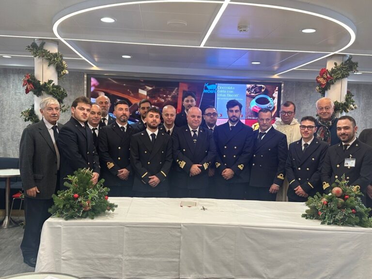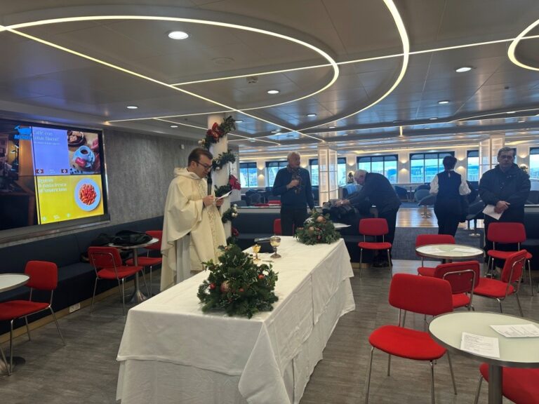 Il Natale, per chi vive e lavora sul mare, possiede un significato che va oltre la tradizione. È un momento in cui la distanza dalla terraferma e dagli affetti si fa sentire con maggiore intensità. Per questo, la celebrazione della Santa Messa a bordo di una nave non è soltanto un rito, ma un ponte gettato tra il molo e l’orizzonte, un riconoscimento necessario della dignità di migliaia di lavoratori che, anche nel giorno della Natività, restano al loro posto per garantire il commercio e i collegamenti mondiali. Quest’anno il cuore spirituale dello scalo labronico ha battuto a bordo della Moby Fantasy, l’ammiraglia della flotta Moby Lines. Il traghetto, simbolo di modernità e sostenibilità ambientale, ha ospitato il personale marittimo e gli ufficiali per la liturgia natalizia presieduta da Padre Emilio Colaczyk, cappellano del Porto di Livorno. L’iniziativa è stata resa possibile grazie all’impegno costante dell’Associazione Stella Maris, l’istituzione che nel porto opera come braccio della Chiesa per accogliere e assistere i marittimi in transito. In un contesto dove spesso il lavoro non permette lo sbarco, la Stella Maris ha portato la comunità direttamente a bordo, garantendo che nessuno si sentisse escluso dalla festa. Durante la celebrazione, Padre Emilio ha offerto una profonda riflessione sul Vangelo del giorno, tracciando un parallelo tra la storia antica e la vita moderna sul mare. Ha ricordato come l’Israele del tempo di Gesù stesse attraversando un periodo di profonda crisi, tra guerre e l’oppressione del dominio romano: “In un tempo in cui la speranza sembrava perduta, Gesù nasce nel nascondimento e nel silenzio-ha spiegato Padre Emilio- Dio non ha scelto i palazzi del potere, ma ha annunciato il Suo Dono ai pastori, persone che all’epoca erano considerate marginali e poco raccomandabili”. Questa riflessione assume un valore particolare per i lavoratori del mare, spesso “invisibili” agli occhi di chi sta a terra. Il messaggio è chiaro: la vera luce nasce proprio nelle periferie, nel silenzio dei turni di notte e nella solitudine delle plance, dando dignità a ogni sacrificio quotidiano. Un momento di particolare emozione è stato segnato dall’apertura della celebrazione a tutto il bacino portuale. La liturgia è stata infatti trasmessa via radio in lingua inglese, permettendo ai marittimi di ogni nazionalità, a bordo di tutte le navi ormeggiate a Livorno, di unirsi alla preghiera. Le onde radio hanno così trasformato il porto in un’unica, grande assemblea multiculturale, abbattendo le barriere linguistiche nel segno della fratellanza universale. A conclusione della cerimonia, il Presidente della Stella Maris di Livorno Giorgio Botti, insieme agli altri membri dell’associazione, ha voluto rivolgere gli auguri e un saluto affettuoso a tutti i presenti: “Poter offrire un momento di preghiera e di conforto a chi opera nel nostro porto è la ragione stessa della nostra esistenza: Ringraziamo la compagnia Moby e tutti i volontari per aver permesso che questo Natale portasse un messaggio di speranza a ogni navigatore e operatore del mare”.