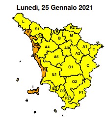 Maltempo in Toscana, nuova allerta meteo dalla sala operativa unificata della Protezione civile (leggi qui dei danni alla Terrazza). E’ prorogato il codice arancione per mareggiate dalla notte di domenica 24 gennaio fino alla giornata di lunedì 25. In particolare dalla notte è previsto il rapido aumento del moto ondoso a nord dell’Elba fino a mare agitato o molto agitato. Da lunedì è attesa una nuova perturbazione alla quale si assoceranno forti venti occidentali, piogge sparse e deboli nevicate in Appennino a quote medio-basse. Prorogato il codice giallo per il vento, di cui è atteso da lunedì 25 il rinforzo da ovest, sud-ovest, con forti raffiche su nord Arcipelago, aree costiere centro-settentrionali e zone collinari limitrofe. Dalla sera di lunedì 25 gennaio locali formazioni di ghiaccio nelle zone interne della regione e anche in prossimità della costa.