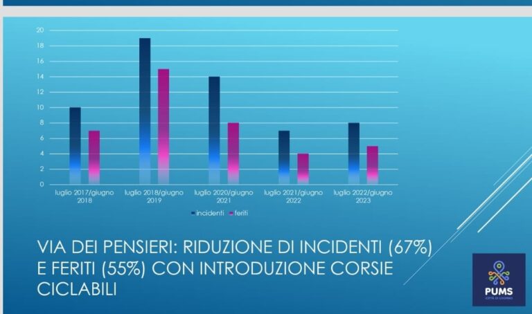 In viale Italia – una delle strade della città storicamente a maggior rischio incidenti anche se i dati dicono che sono in calo (nel primo semestre del 2023 sono stati 30 contro i 40/50 relativi ai primi semestri dal 2017 al 2022) – è stata disegnata la “famosa” linea tratteggiata. “Il numero di sinistri in viale Italia è diminuito e vogliamo ridurlo ancora – spiega l’assessora Giovanna Cepparello che ringraziamo per la disponibilità – Questo intervento va in questa direzione. Interrotto per maltempo, appena riprenderà la ditta proseguirà in direzione nord”. La linea tratteggiata, già presente dalla Rotonda di Ardenza a Barriera Margherita, ha una doppia finalità: “La prima e più importante è quella che rende le due corsie della carreggiata a norma a livello di misura: erano molto grandi, in alcuni tratti superavano i 4,5 metri, e la corsia troppo larga induceva a premere sull’acceleratore. Ora l’abbiamo portata a 3,5 metri. Il secondo beneficio è per chi esce dalla macchina: troverà uno spazio più protetto in quanto le auto viaggeranno più distanti dagli stalli”. Da segnalare, infine, che l’introduzione della corsia ciclabile in via dei Pensieri ha portato ad una riduzione di incidenti (67%) e feriti (55%) e che nel parcheggio accanto alla Baracchina Bianca è nuovamente presente lo stallo giallo riservato ai disabili.