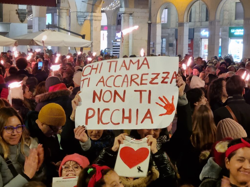In migliaia, almeno duemila e tanti, tantissimi anche i bambini con genitori e insegnanti, in piazza Grande per la fiaccolata rumorosa per "Giulia e per tutte" nel giorno della Giornata per l'eliminazione della violenza contro le donne