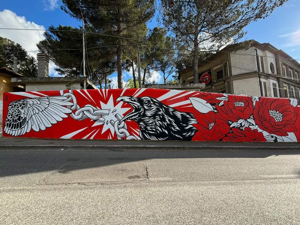 “Per la libertà”. E’ questo il nome del murale di Lucamaleonte realizzato sul muro del The Cage in via del Vecchio Lazzeretto nell’ambito del progetto Citizen Art – Il valore della cittadinanza attiva. Un’opera partecipata, quindi, che ha visto il coinvolgimento di alcuni giovani come occasione di formazione e confronto. “Il murale – spiega l’artista romano, che ringraziamo per la disponibilità – è ispirata nei colori bianco, nero e rosso ai colori del live club livornese e rappresenta la liberazione attraverso un corvo che spezza le catene e prende il volo. Hanno partecipato alla realizzazione del murale anche dei ragazzi, diciamo così, non addetti ai lavori ed è per questa ragione che quando ho fatto il bozzetto ho pensato di non farlo troppo complicato. Ringrazio MuraLi per avermi contattato”. Ricordiamo che Lucamaleonte è anche l’autore del murale in via Cecconi. “Erano anni che aspettavamo di poter abbellire questo muro. Il disegno è molto bello così come è bello vedere i ragazzi del The Cage e gli alunni delle scuole presenti qui vicino a noi soffermarsi ad ammirarlo” è il commento di Toto Barbato. Nei prossimi giorni “Per la libertà” verrà arricchito, ai lati, dai graffiti dei writers livornesi.