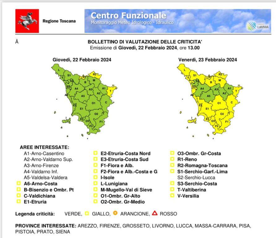 Il Centro funzionale meteo della Protezione civile regionale ha prolungato la validità del codice giallo in corso per rischio vento fino alle ore 22 di venerdì 23 febbraio. Il codice giallo in corso per rischio mareggiate cesserà alle ore 8 di sabato 24 febbraio. Venti da ponente con raffiche fino a 60-80 km/h, mari agitati a nord di Capraia, precipitazioni diffuse sul nord-ovest della Toscana in graduale estensione.