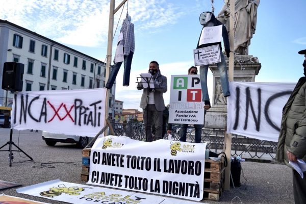 Tra i tanti striscioni anche quello del gruppo “IncaXXppiati”, il gruppo livornese di agenti di commercio, settore horeca, che insieme ad Api ha organizzato il sit-in per rivendicare le urgenti necessità dei settori più colpiti da questa crisi.