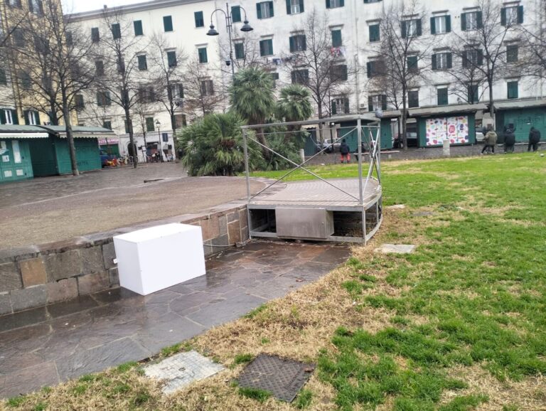 Il palchetto vuoto in piazza Garibaldi dove fino a ieri sera era posizionato l'albero