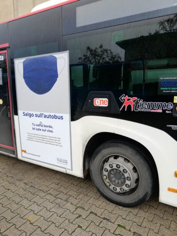 Tira su la mascherina coprendo interamente naso e bocca, solo così proteggerai te stesso e gli altri viaggiatori. Un piccolo gesto di attenzione che può contribuire al contenimento della diffusione del virus”, spiega il testo dei 500 manifesti diffusi su fermate e fiancate dei bus dei capoluoghi della Toscana.