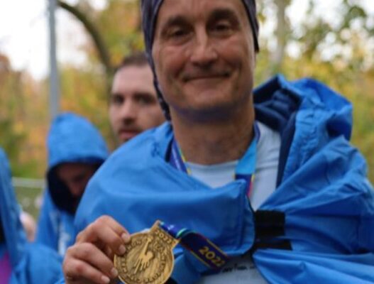 Luca Carmignani, 58 anni, con la medaglia della maratona di NY 2022 dopo aver tagliato il traguardo
