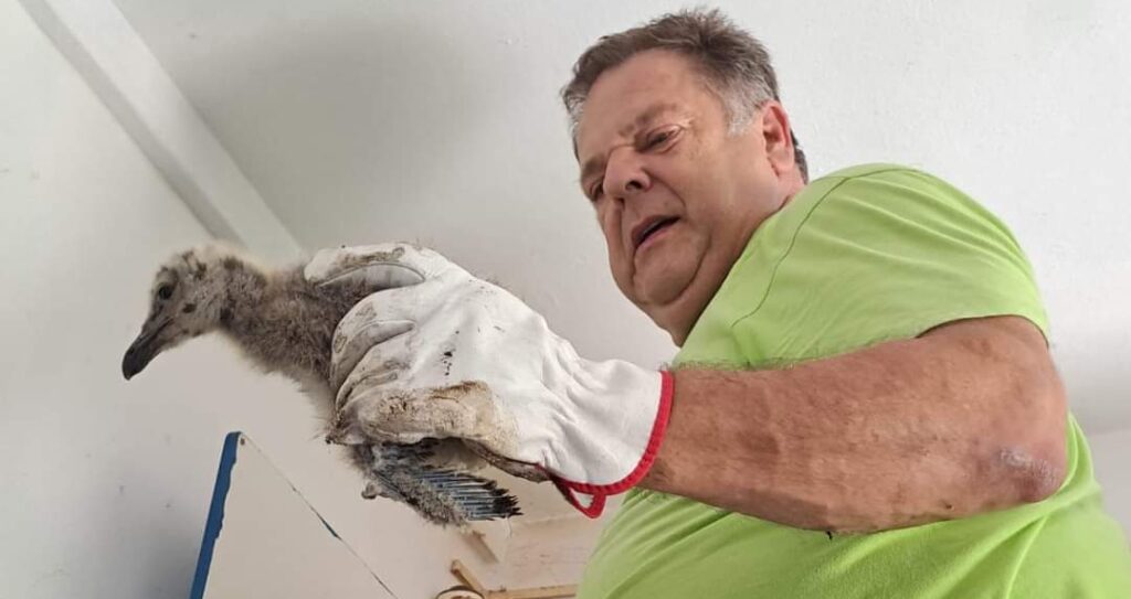 Franco Fantappiè, presidente di Anpana, con il cucciolo di gabbiano dopo averlo estratto dalla cappa