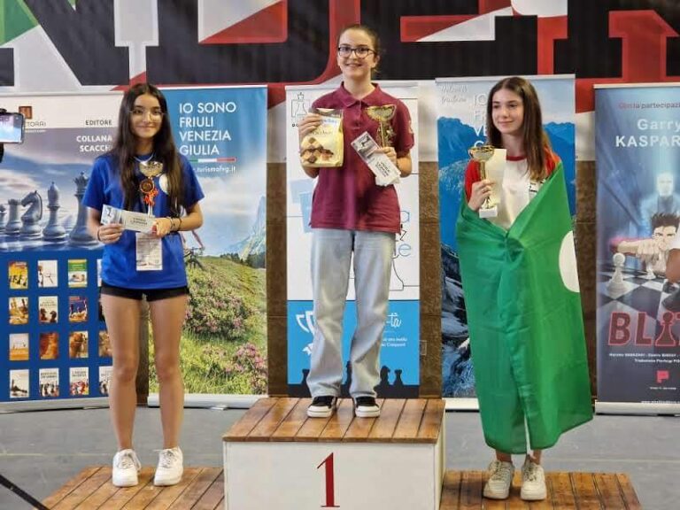 Greta Viti vince il campionato italiano under 14 femminile di scacchi con un perentorio 8 su 9. La livornese ripete l’exploit dello scorso anno nella categoria superiore superando 40 agguerrite avversarie. Decisiva l’ultima partita in cui Greta ha dovuto rimediare ad un errore in apertura per poi vincere con una brillante combinazione di scacco matto. Sembrava tutto facile dopo la vittoria con la titolata Gaia Costantino ma al quinto turno arrivava la doccia fredda della sconfitta con Amalia Manco. Ma Greta non si disuniva e metteva in fila altre 4 vittorie che la portavano al titolo italiano. Ottima la prestazione della società Livorno Scacchi, prima di Toscana e nona in Italia. Ottimo risultato di Ettore Sassi che conquista un quarto posto ex aequo su 175 giocatori nel torneo under 12 con 7 vittorie e 2 sconfitte. Edoardo Fulgentini chiude ottavo ex aequo nello stesso torneo ma si è letteralmente mangiato il secondo posto con una svista nell’ ultima partita che aveva fino all’ora dominato. Svista comprensibile dopo 8 giorni di dure battaglie e ore e ore di gioco sempre all’attacco nello stile del brillante 2012 livornese. Buona la prova di Filippo Buonagurio e Samio Leoni . Hanno completato la squadra amaranto Mario Federico, Gabriele Valtriani e il veterano Raul Barbetti. Una parola a parte per il piccolissimo Luca Doronzo all’esordio assoluto a soli 7 anni. Il campionato italiano giovanile si è svolto a Tarvisio con la partecipazione record di oltre 1000 giocatori. La scuola di scacchi Carlo Falciani al museo di storia naturale, che tanti campioncini ha sfornato in questi anni, riprenderà le lezioni il primo sabato di ottobre mentre gli scacchi saranno protagonisti a Effetto Venezia.