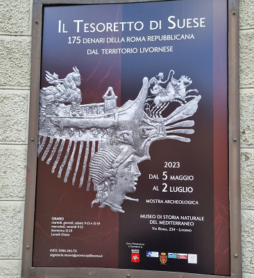 Scoperte 175 monete di epoca romana, tutti denari in argento, risalenti al periodo tra il 175 e 82 a.c. per un valore, oggi, di 25.000 €. “Emozionato? Si metta nei miei panni, ero sotto shock”. A parlare a margine della conferenza stampa di presentazione delle monete è Alberto Cecio, membro del Gruppo Archeologico Paleontologico Livornese (GAPL), che a novembre 2021, nella Tenuta Bellavista Insuese,  ha fatto la scoperta dando di fatto il via, come l’ha definita la presidente della Provincia di Livorno Sandra Scarpellini, ad una “virtuosa collaborazione tra enti” (Provincia di Livorno, Soprintendenza di Livorno e Pisa, Museo di Storia Naturale, Archivio di Stato, Regione Toscana, GAPL e Biblioteca Labronica “Guerrazzi”, senza dimenticare la Tenuta nella persona di Sabina Vitarelli per la collaborazione durante le fasi di recupero) che ha portato dopo un anno e mezzo di studio circa a realizzare la mostra temporanea Il tesoretto di Suese dal 5 maggio al 2 luglio al Museo di Storia Naturale del Mediterraneo. “Durante questo anno e mezzo abbiamo lavorato in gran segreto per poter studiare i reperti”, spiega la curatrice della mostra Lorella Alderighi. archeologa della Soprintendenza Archeologia Belle Arti e Paesaggio di Pisa e Livorno.
