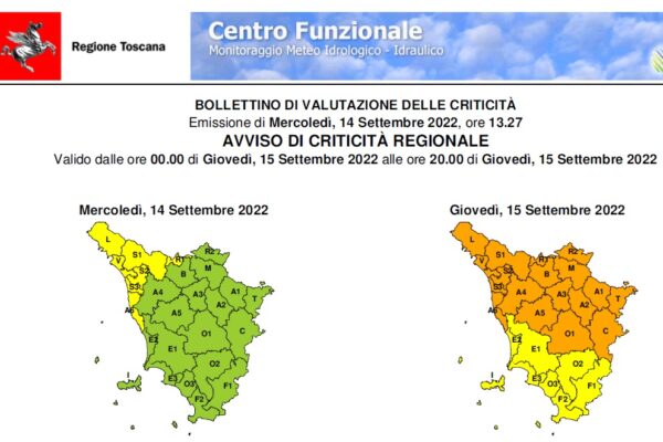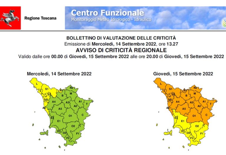 Il Sistema di allettamento di Protezione Civile della Regione Toscana ha diramato un’allerta arancione per temporali forti e rischio idrogeologico idraulico dalle 24 del 14 settembre alle 7 di giovedì 15 settembre anche nel territorio della nostra città. A seguire la criticità è data in attenuazione con codice giallo fino alle 12. Si raccomanda la massima attenzione, di adottare compartimenti adeguati e di mantenersi informati sull’evoluzione meteo che sarà monitorata per tutta la durata dell’allerta. Cessando la criticità arancione alle 7 le scuole al momento saranno regolarmente aperte, in caso di evento critico in corso oltre la durata del codice arancione l’informativa sulla conferma o meno del primo giorno di scuola sarà immediata. A tal proposito la protezione civile, i servizi educativi, i dirigenti scolastici e il personale in servizio opereranno per valutare la completa agibilità delle strutture e informeranno le famiglie su eventuali e possibili chiusure. Si invitano i cittadini a seguire l’evoluzione e a raccogliere informazioni dai canali ufficiali anche nelle prime ore della giornata del 15 settembre.