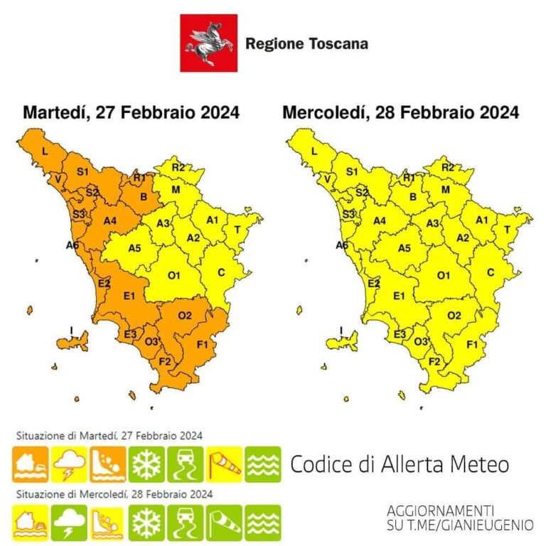 Scuole aperte mercoledì 28 febbraio. L’allerta arancione scende a gialla in tutta la Toscana e durerà fino alle 14. Prosegue fino alla mezzanotte di oggi l’allerta arancione per rischio idrogeologico e sempre fino a mezzanotte sarà inoltre in vigore il codice giallo per rischio di forti temporali. Un altro codice giallo interesserà il territorio livornese (zone limitrofe allo Scolmatore d’Arno) fino alle 14 di mercoledì 28 febbraio per rischio idraulico del reticolo principale. Si ricorda che fino al perdurare dell’allerta arancio (quindi per tutta la giornata odierna) rimarranno chiuse le scuole di ogni ordine e grado, ludoteche e servizi educativo-scolastici pubblici e privati, i centri diurni, parchi pubblici e cimiteri cittadini, il canile comunale. Fino al perdurare del codice giallo per rischio idrogeologico/idraulico, quindi fino alle ore 14 di domani, mercoledì 28 febbraio, rimarrà chiuso per motivi precauzionali il tratto di via Aiaccia che attraversa la cassa d’espansione del torrente Ugione (a partire dal ponte sull’Ugione). Questa notte la Protezione civile comunale, la Polizia Locale e le squadre del volontariato sono state impegnate in un grande lavoro di controllo, monitoraggio ed interventi in varie zone della città, seguendo l’evolversi delle condizioni di tutti i corsi d’acqua e approntando gli interventi necessari a risolvere alcuni allagamenti su strade e sottopassi, anche con l’utilizzo di idrovore. Non si sono registrati particolari problemi per le abitazioni e i cittadini.